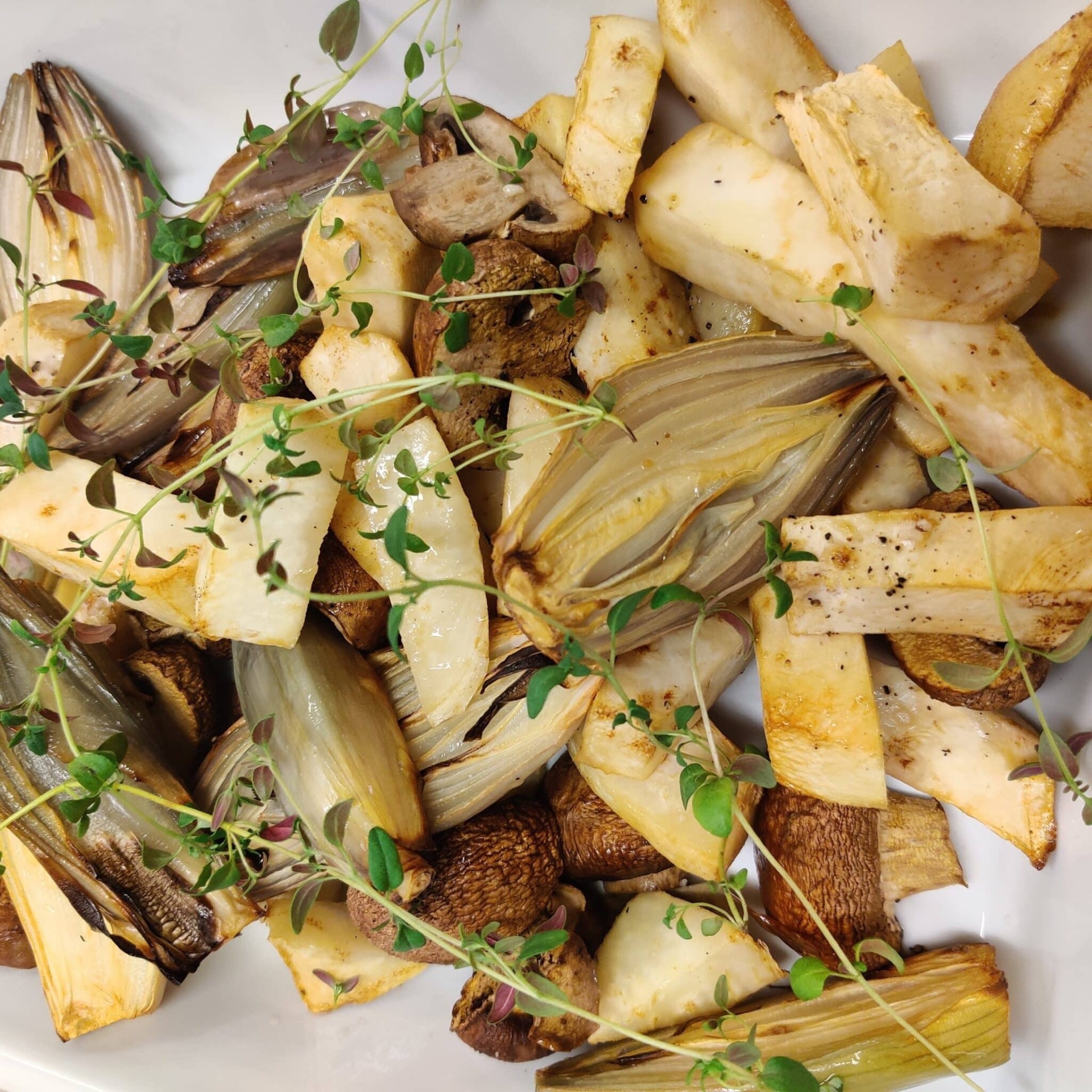 Øl braiseret dansk gris med bbq og karamelliserede selleri og skalotter med timian.